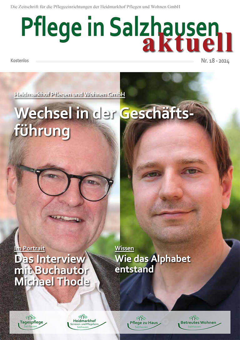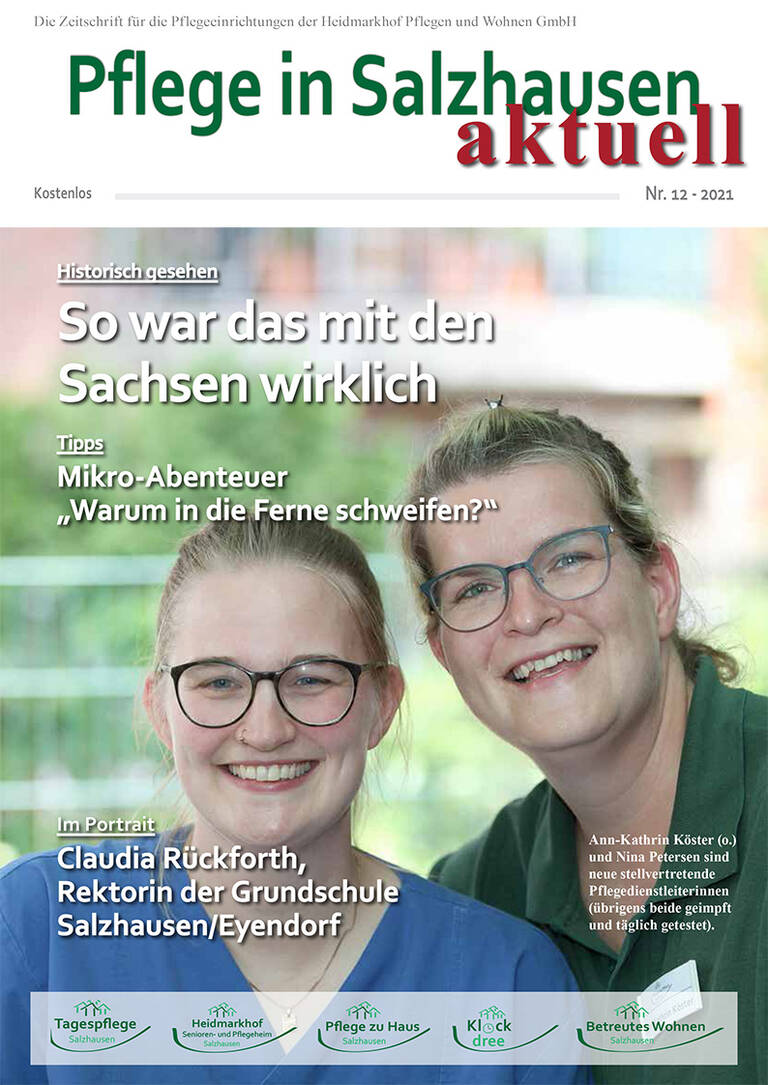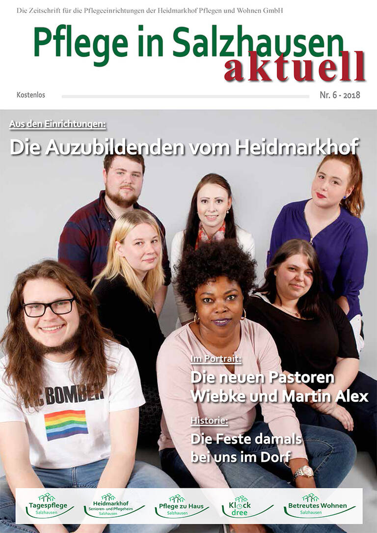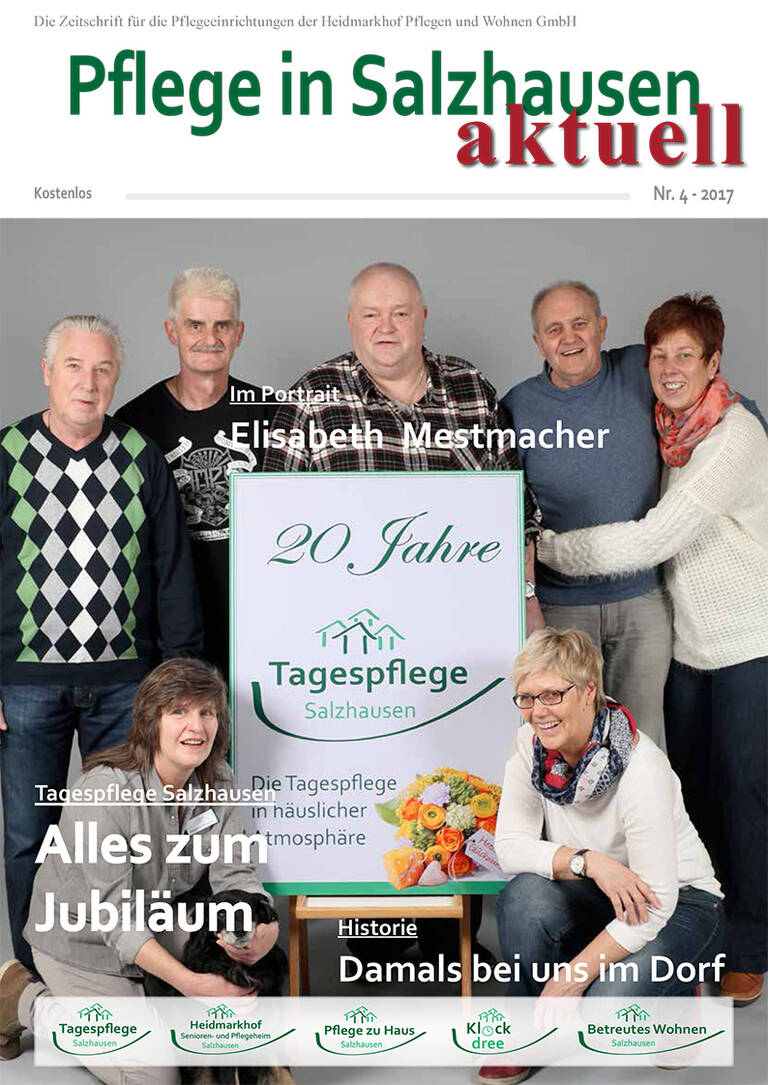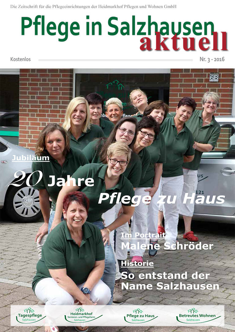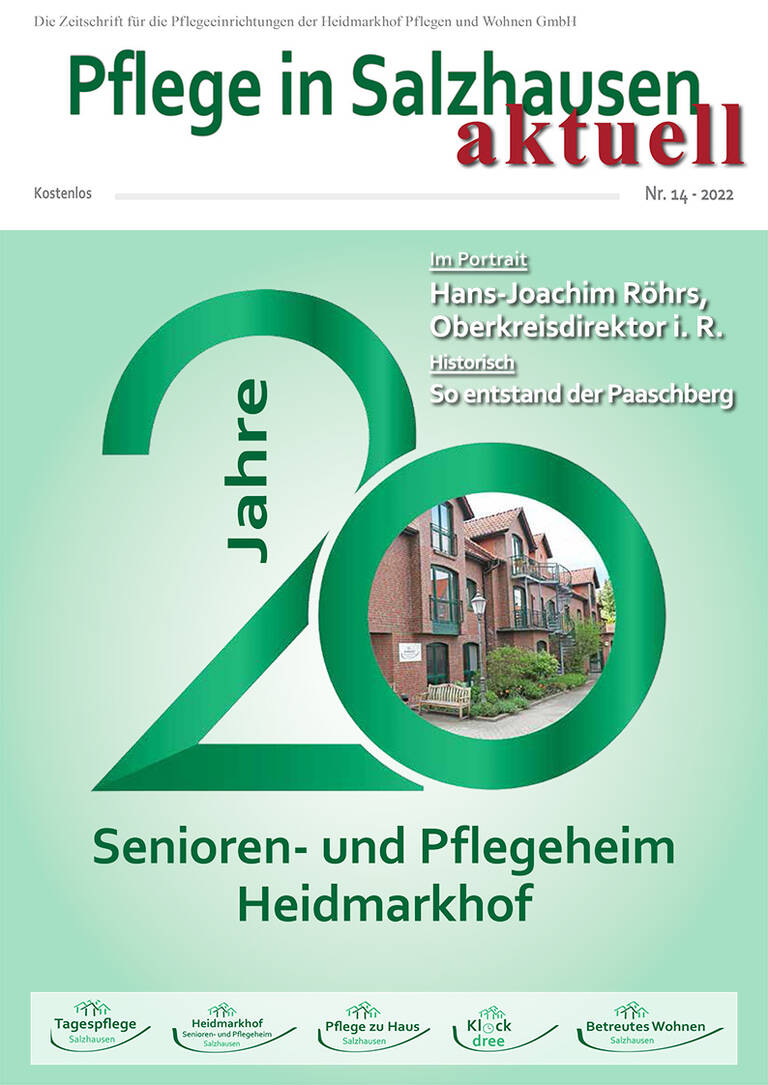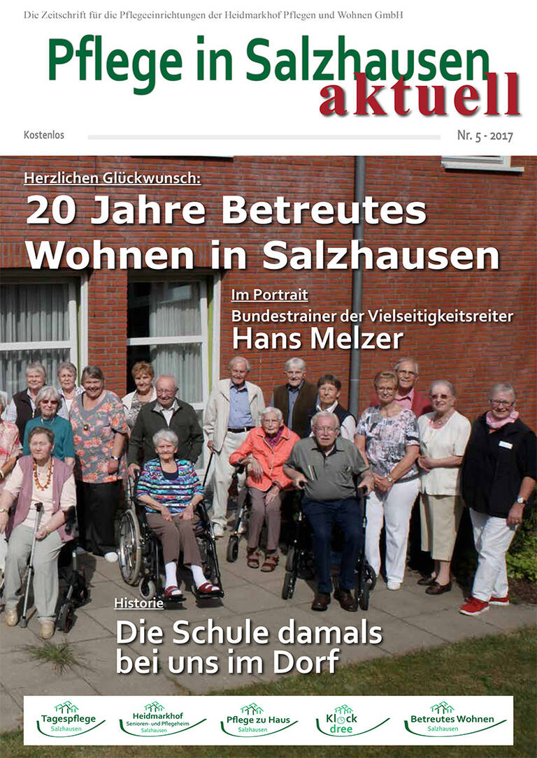 Stöbern Sie in unserem Archiv der Zeitschrift „Pflege in Salzhausen - Aktuell“ , welche für die Pflegeeinrichtungen der Heidmarkhof Pflegen und Wohnen GmbH herausgegeben wird. Die Zeitschrift erscheint jährlich und bietet viele Einblicke, Geschichten und Hintergrundberichte.